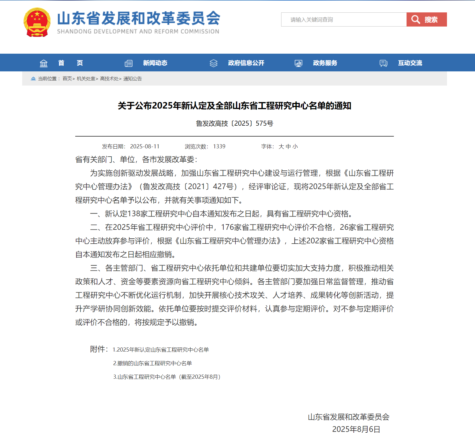 近日,山东省发展和改革委员会发布《关于公布2025年新认定及全部山东省工程研究中心名单的通知》(鲁发改高技〔2025〕575号),我公司申报的中医药抗衰老产品开发和评价山东省工程研究中心(以下简称工程研究中心)获批认定。