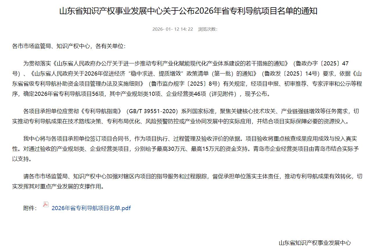 山东省专利导航项目旨在发挥专利信息的决策支撑作用,服务创新资源高效配置。公司此次入选的项目,将聚焦高价值专利组合产业化、研发创新辅助与知识产权风险预警等核心需求,精准规划核心技术研发路径,加速关键技术成果转化,强化企业在相关产业中的技术引领地位。